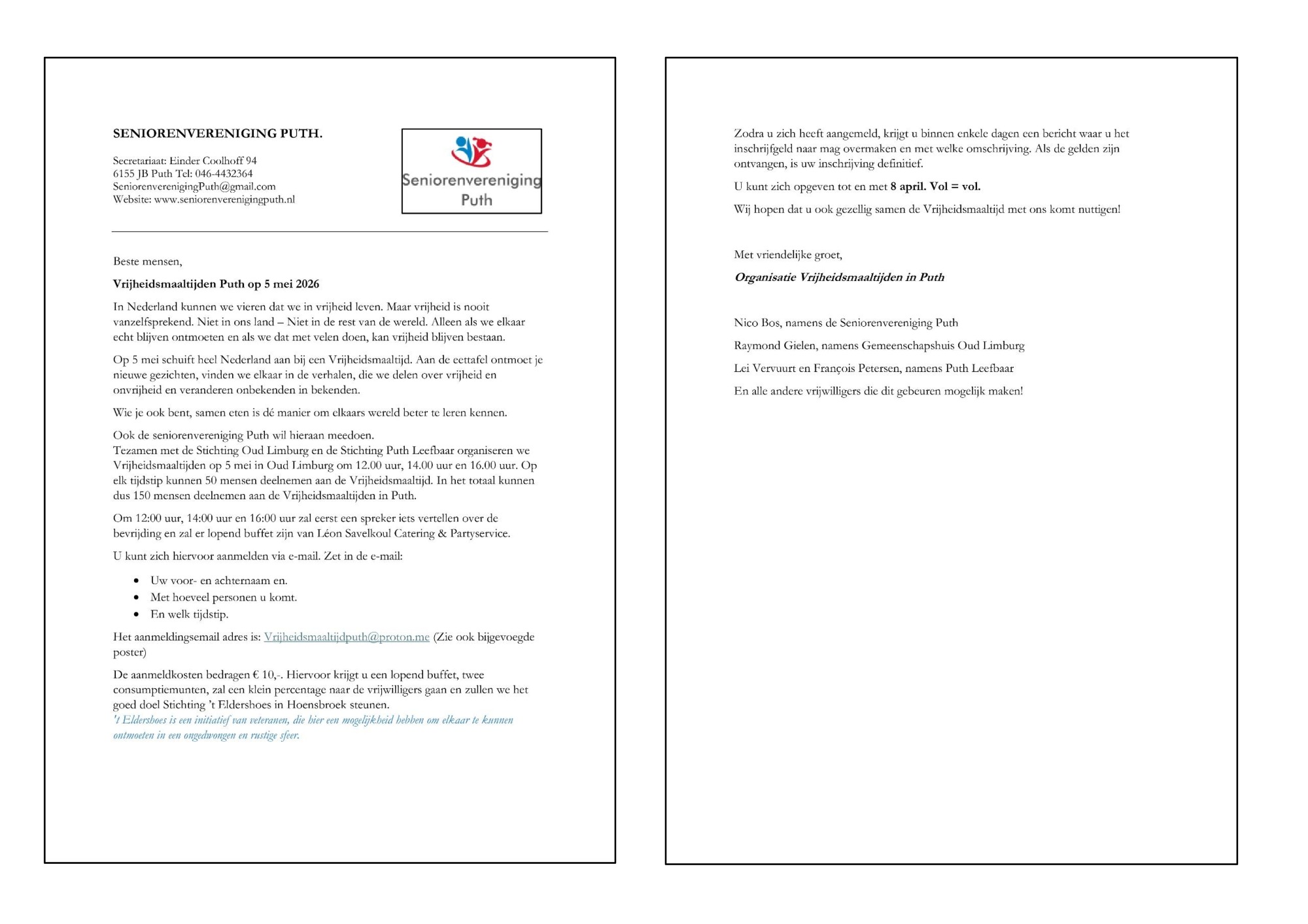 - Dinsdag 5 mei, Vrijheidsmaaltijd in gemeenschapshuis Oud Limburg.